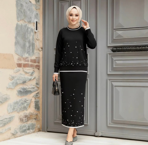بلوز دامن وارداتی روی کار مروارید کار شده نخ پنبه تریکو فری سایز ۳۴الی۴۶