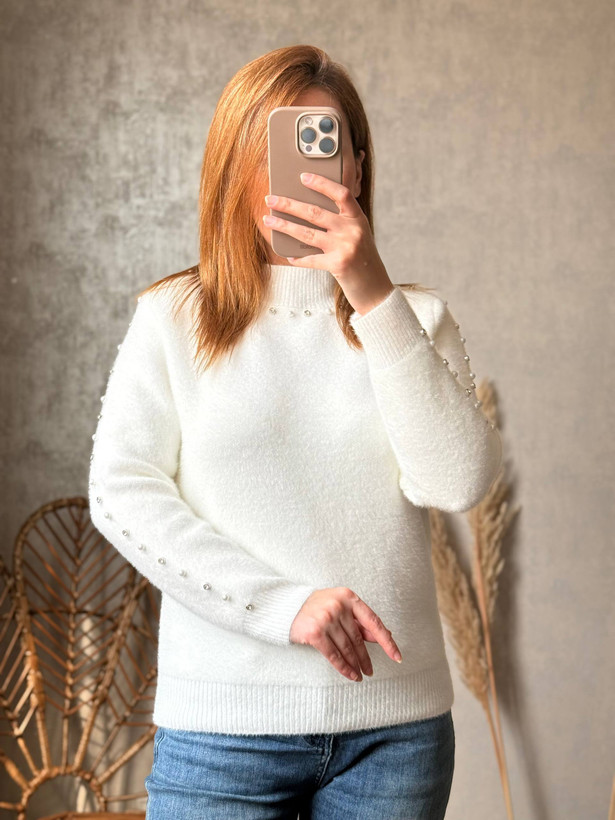 بافت گرم بالا یقه و آستین کار مروارید کار شده که همش پری شدست